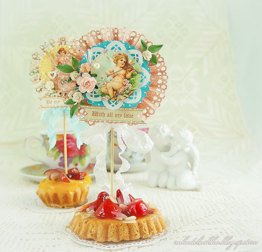 Нужно сделать топперы для капкейков. А так как это задание приурочено к празднику всех влюбленных - Дню Святого Валентина, то топперы должны быть очень романтические. Сначала у меня была идея сделать их в виде сердечек, но потом я передумала. А когда я увидела замечательную бумагу Sweet Sentiments от Graphic45, то сразу же решила, что буду делать только из нее. Такие нежные оттенки и такие чудесные ангелочки!